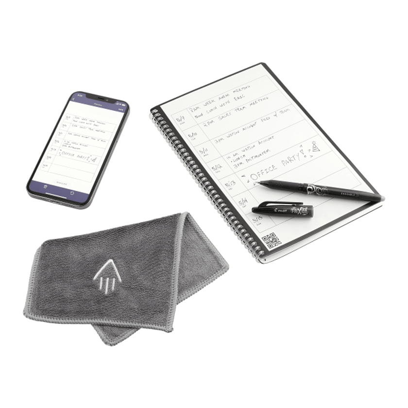 The Rocketbook Fusion is designed for every classroom, office, and personal mission. The Fusion is a reusable pen and paper notebook with seven different page templates that connect to your favorite cloud services. 42 futuristic pages are packed with calendars, to-do lists, and notetaking layouts. And of course the Fusion is made with patented reusable Core technology. The synthetic paper allows you to write smoothly with a Pilot FriXion pen, then magically wipe clean with a damp cloth to reuse again and again! Use the Rocketbook app to blast your notes, plans, lists, and big ideas to the cloud for proper organization. Then, erase and reuse your Fusion for your next adventure! This set includes Rocketbook Fusion Notebook, Pilot Frixion Erasable Pen, microfiber wipeable cloth, instruction manual and retail gift box.